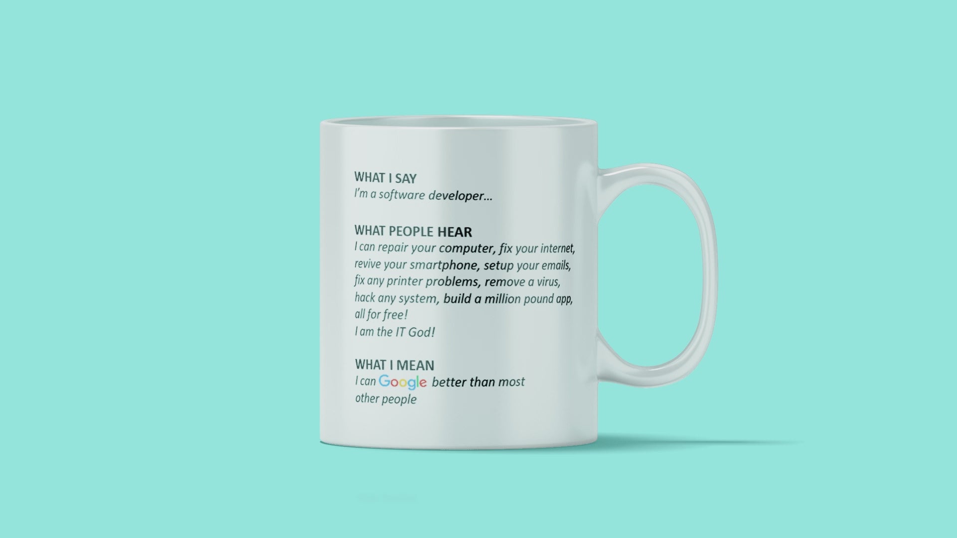 This mug is the perfect gift for any software developer. It highlights the hilarious daily struggle every software developer faces when trying to explain what their job is!