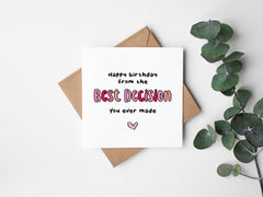 Celebrate a loved one's special day with this hilarious Happy Birthday To The Best Decision You Ever Made funny birthday card! Perfect for sending a little humour and love their way on their birthday, this card is sure to bring a smile to their face.