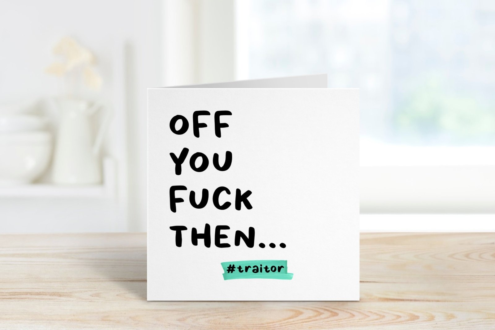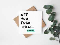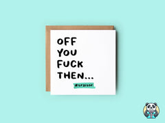 Say farewell to your colleague with a touch of humour. This "Off You Fuck Then" card will leave them laughing and send them off on their next adventure with a smile. Perfect for any job departure!